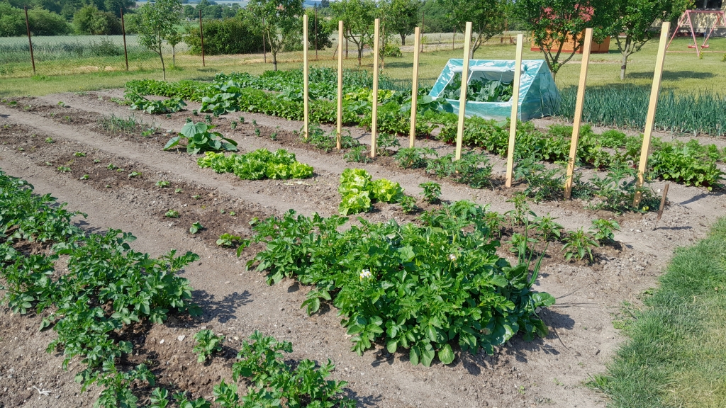 Od konce května je to jen radost, saláty, ředkvičky, okurky, mangold, nať z cibule, hrášek. Těšíme se na první mrkvičku, kedlubny a rané brambory. Později budou okurky nakládačky, rajčata, papriky, cibule, cukety a nakonec petržel, celer a řepa.