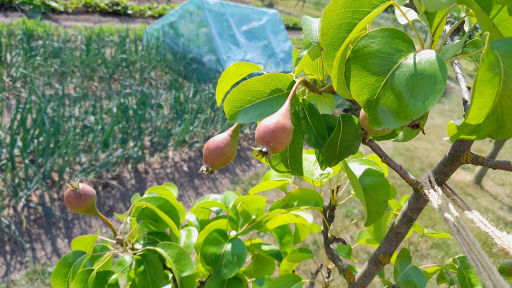 Zeleninové záhony sousedí s hrušněmi a jabloněmi, které nasadily malé hruštičky a malá jablíčka, viz obrázky 9 a 10.